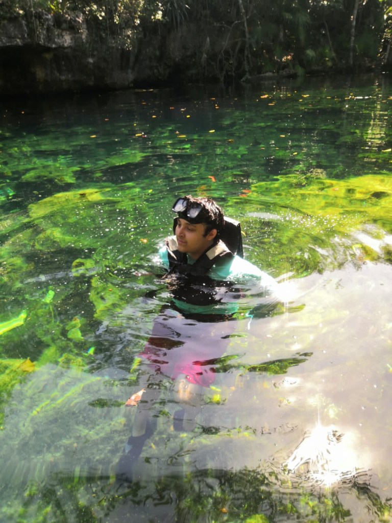 Lo estaban disfrutando tanto que luego me animé y los acompañé. Bueno, hasta Paco grande se metió, dije, “¡ahí les voy!”. El agua estaba fresca y con una transparencia que nos permitía ver a los peces que se querían comer los vellos de nuestras piernas —bueno, no tanto los míos, que soy lampiño—. En momentos, el agua se sentía tibia y otras veces mucho más fría. Se nos olvidó la chinga de la caminata forzada hacia las ruinas.