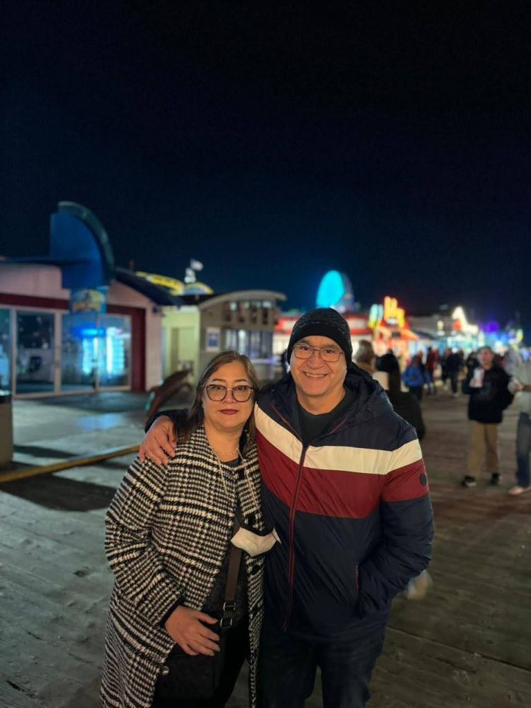 Cuando desperte, casi dos horas después, el plan ya estaba hecho. El muelle de Santa Monica quedaba a escasos veinticinco minutos en auto y hacia allá nos dirigimos. Ya había oscurecido, temprano, pues apenas eran las 6:30 PM. Ya en esa zona perdí la vuelta y tardamos nuevamente en tomar el camino correcto, pero al fin llegamos. Buscaba un estacionamiento económico y al final quedé en uno de quince dólares por tiempo ilimitado que era parte del Shore Hotel. Bajamos del auto e iniciamos nuestra primera caminata del viaje. Hacia frío y la brisa soplaba fuerte. Nos encaminamos hacia el muelle cruzando el puente Pier Arch sobre la avenida Pacific Coast. El lugar estaba muy concurrido, gente que ya venía y mares de gente que apenas iba, como nosotros.