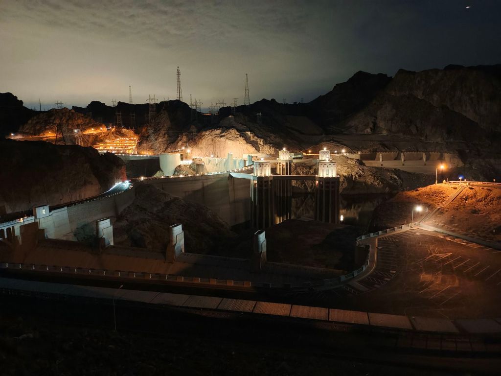Las noches llegan muy temprano en Nevada. Cuando llegamos a la presa ya había caído la noche. Estábamos en la carretera y viramos a la derecha del camino para tomar el camino hacia la entrada. Allá, muy abajo, se observaban unas torres iluminadas por brillantes luces blancas, un reflejo debajo de ellas nos daba pista de la existencia de una superficie líquida frente a ellas.